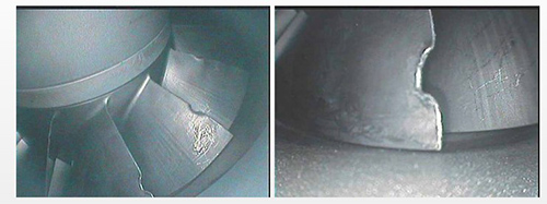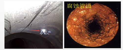 左邊圖片是對管子的檢測圖像采集,上圖很明顯的可以看到管子內部存在著起皮。右邊圖可以看到管子內部已經被腐蝕。