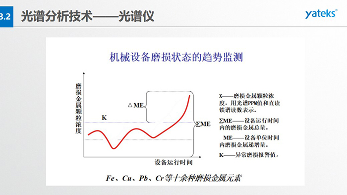 光譜儀的優(yōu)劣勢:優(yōu)勢:1)速度較快40秒;2)精度高PPM微量級;3)取樣少,可同時(shí)進(jìn)行多元素   測定,適用范圍廣; 4)自動(dòng)化程度高,有多種連鎖保護(hù)。弱勢:1)檢測的磨粒尺寸比較小,2微米效率最高,最大尺寸不超過10微米; 2)不能提供磨粒的形態(tài)、尺寸、顏色等直觀形象的信息,因此光靠光譜分析的結(jié)果直接對摩擦副的狀態(tài)作出判斷有很大的困難; 3) 價(jià)格較貴。