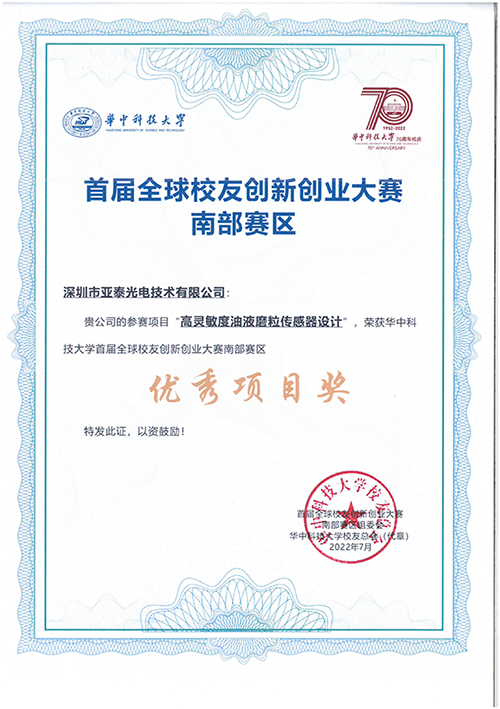 2022年6月26日,華中科技大學全球校友首屆創新創業大賽南部賽區決賽在深圳圓滿收官。深圳市亞泰光電技術有限公司在此次比賽中,“高靈敏度油液磨粒傳感器設計”和“內窺三維測量與識別”兩個項目榮獲“優秀項目獎”。