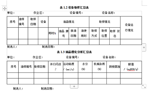 為了便于傳遞信息,對(duì)各類數(shù)據(jù)進(jìn)行對(duì)比和匯總分析,需要生成各類報(bào)表, 以備分析需要選擇。生成的報(bào)表可包括:①油液報(bào)表,包括油樣明細(xì)表、單機(jī) 取樣記錄匯總表、油樣月度匯總表等;②油品理化分析報(bào)表,包括油樣分析結(jié) 果表、單機(jī)潤(rùn)滑理化分析匯總表、單臺(tái)設(shè)備潤(rùn)滑記錄表等;③鐵譜分析結(jié)果表, 包括磨粒成分匯總表、磨粒濃度數(shù)據(jù)匯總表、鐵譜分析記錄表等;④油液監(jiān)測(cè) 結(jié)論表等。下面給出了 “設(shè)備取樣匯總表”和“油品理化分析匯總表”的樣表, 見(jiàn)表1.1和表1.3。