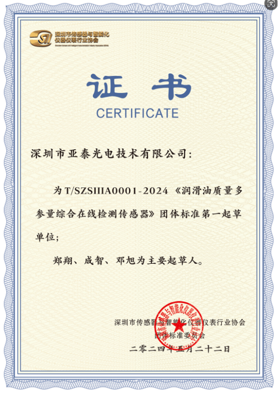 在《深圳市培育發(fā)展智能傳感器產(chǎn)業(yè)集群行動(dòng)計(jì)劃(2022-2025年)》的指導(dǎo)下,傳感器企業(yè)越來越成為深圳國民經(jīng)濟(jì)和社會(huì)發(fā)展的新質(zhì)生產(chǎn)力,但與此同時(shí),在潤滑油在線檢測(cè)傳感器領(lǐng)域并沒有具有針對(duì)性的指導(dǎo)標(biāo)準(zhǔn)。亞泰光電牽頭起草全國首個(gè)油液監(jiān)測(cè)傳感器器團(tuán)體標(biāo)準(zhǔn)(T/SZSIIIA0001-2024),已實(shí)施并出版(由中國標(biāo)準(zhǔn)出版社出版發(fā)行,各地新華書店經(jīng)銷)。這是對(duì)深圳市亞泰光電技術(shù)有限公司和相關(guān)潤滑油狀態(tài)監(jiān)測(cè)傳感器企業(yè)提出了更高的要求。它將推動(dòng)傳感器技術(shù)的創(chuàng)新、促進(jìn)潤滑油行業(yè)的數(shù)字化轉(zhuǎn)型、加強(qiáng)行業(yè)間的合作與交流,并提升我國在全球潤滑油市場的地位。隨著標(biāo)準(zhǔn)的深入實(shí)施和應(yīng)用,相信我國潤滑油行業(yè)將迎來更加廣闊的發(fā)展前景。