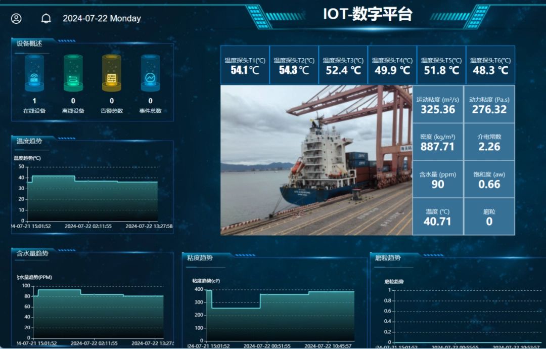 油液被譽為設(shè)備的“血液”。油液監(jiān)測系統(tǒng)通過在岸橋關(guān)鍵部位(如起升/俯仰/小車行走液壓站、大型減速齒輪箱、柴油發(fā)動機/發(fā)電機組)部署在線傳感器或結(jié)合實驗室精密分析,7x24小時守護設(shè)備健康。