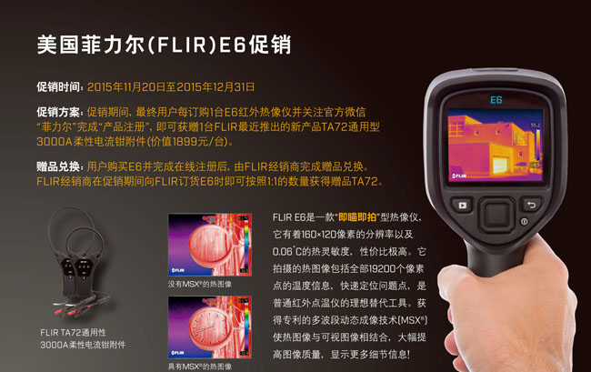 促銷期間,最終用戶每訂購1臺E6紅外熱像儀并關注官方微信“菲力爾”完成“產(chǎn)品注冊”,即可獲贈1臺FLIR最近推出的新產(chǎn)品TA72通用型3000A柔性電流鉗附件(價值1899元/臺)。